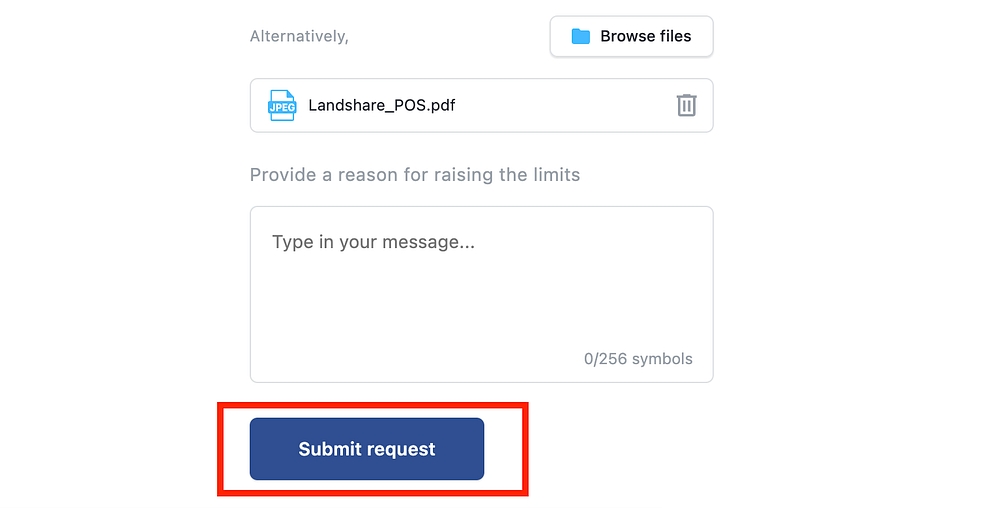 7. Submit your request for a limit increase and wait for Approval. Your request will be processed by the Landshare team.