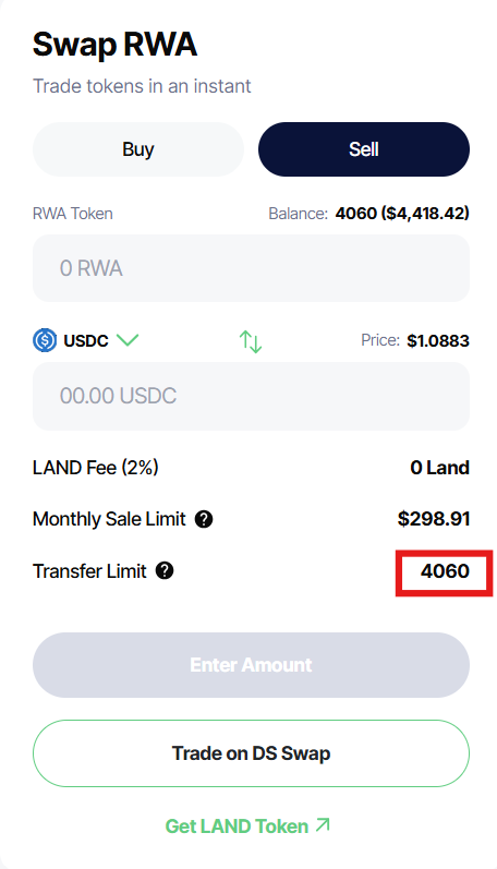 To protect our liquidity pool and investors, we've enabled a secondary transfer limit of **20,000 LSRWA Tokens** by default. This limit applies to **any outbound transfer of LSRWA Tokens** including depositing in the NFT ecosystem, adding liquidity to DS Swap, selling into fixed price liquidity, or trading on DS Swap.&#x20;