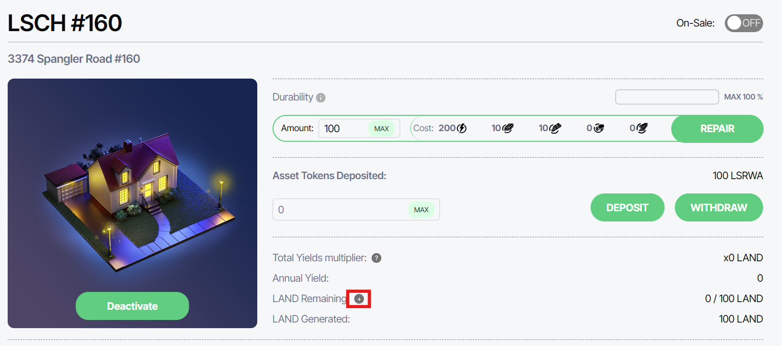 With the Reloading feature, you can use NFT Credits to extend the harvest limit of an existing NFT. To reload an NFT, press the + button next to LAND Remaining: